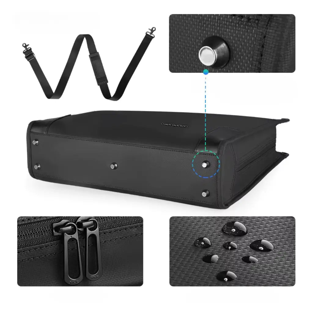 Ontworpen voor de moderne professional die stijl en functionaliteit wil combineren. Deze elegante zwarte laptoptas biedt een perfecte balans tussen robuuste bescherming en een zakelijke, verfijnde uitstraling.