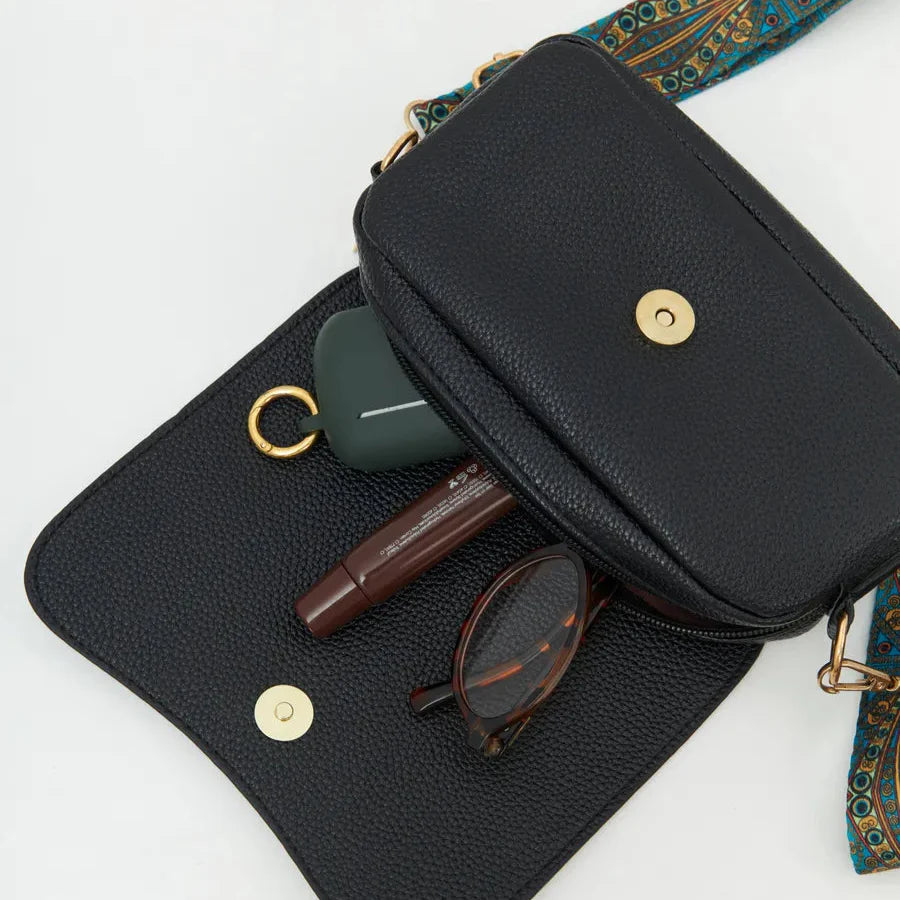 Deze stijlvolle crossbody tas voor dames is de perfecte mix van elegantie en functionaliteit. Gemaakt van hoogwaardig zwart Vegan-leer en voorzien van een opvallende brede schouderband met designprint, voegt deze tas direct klasse toe aan elke outfit.