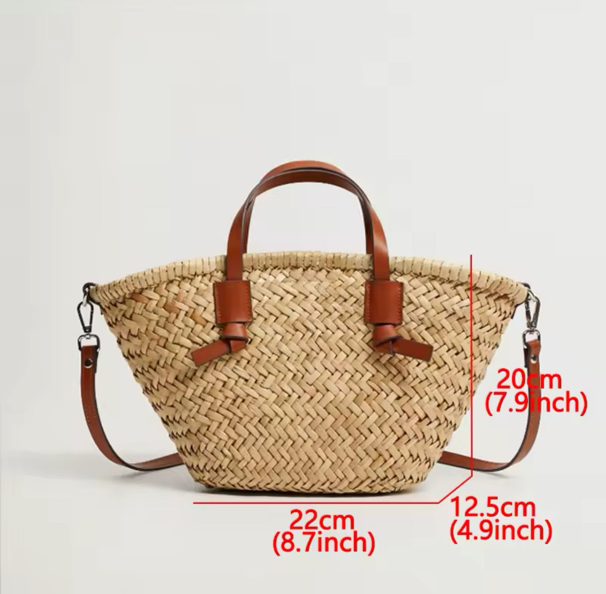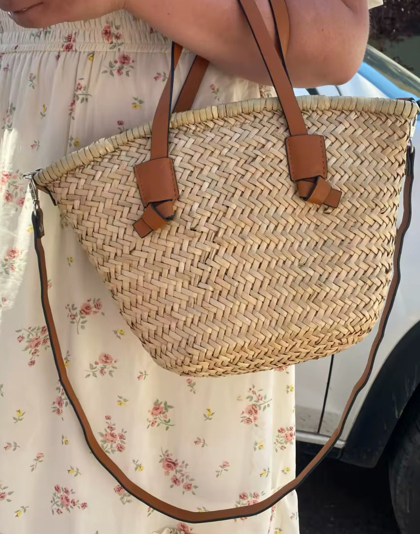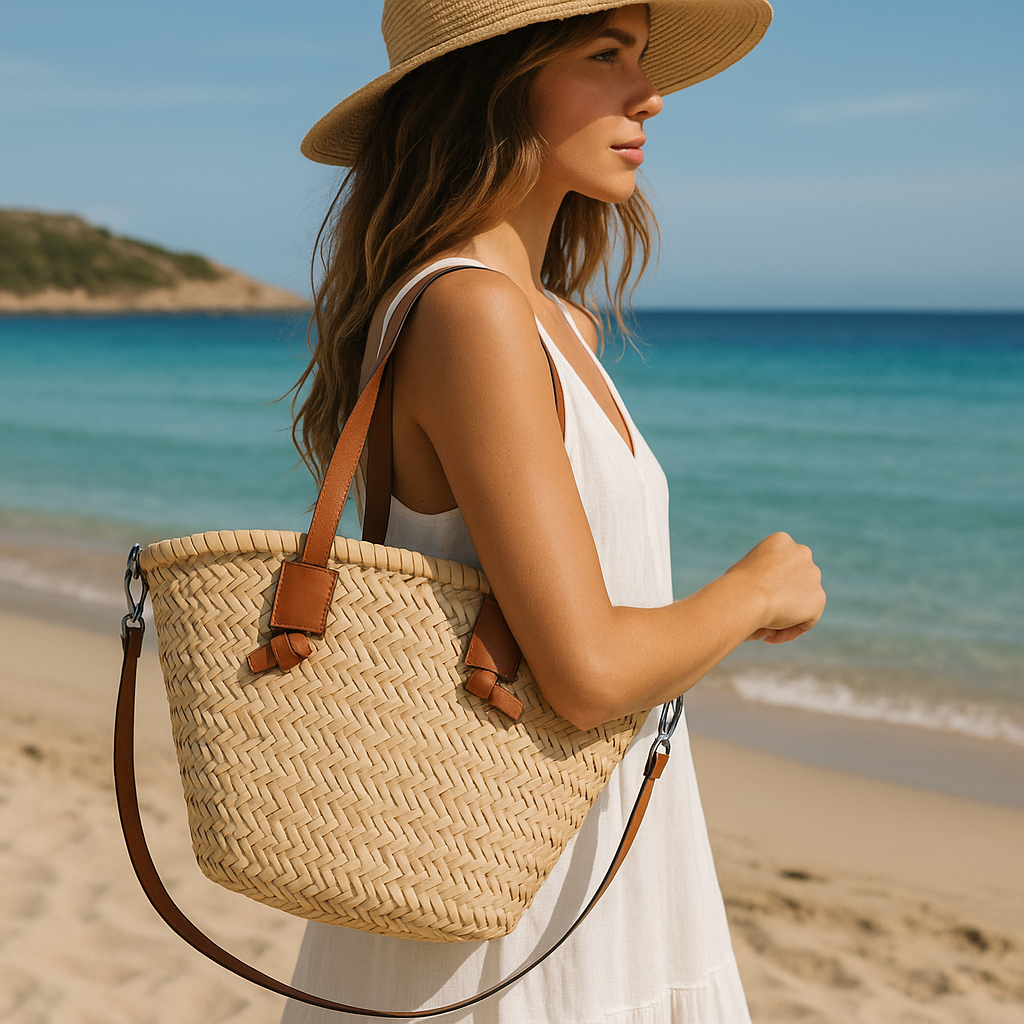 Rieten Strandtas met Leren Details – Stijlvolle Zomertas met Schouderriem