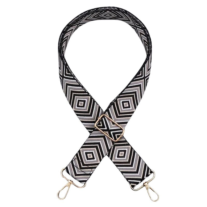 Maak je tas uniek met deze stijlvolle schouderband met geometrisch patroon. Het zwart-witte design geeft iedere tas een moderne en opvallende look. Dankzij de verstelbare lengte en de stevige metalen haken is deze band zowel praktisch als duurzaam. Perfect om je handtas, crossbody of schoudertas een frisse uitstraling te geven.