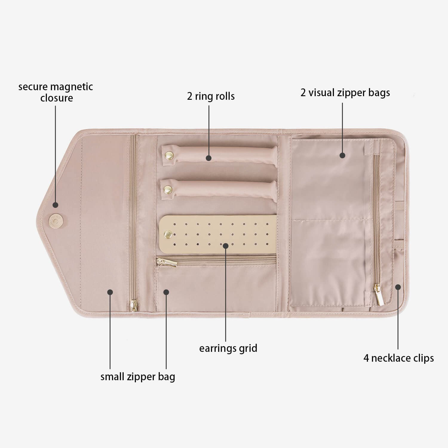 Het tasje heeft meerdere vakjes en ritscompartimenten voor ringen, kettingen, oorbellen en armbanden. Zo voorkom je klitten of beschadigingen onderweg. De zachte voering beschermt je favoriete juwelen, terwijl het slanke design makkelijk in je handtas of koffer past.