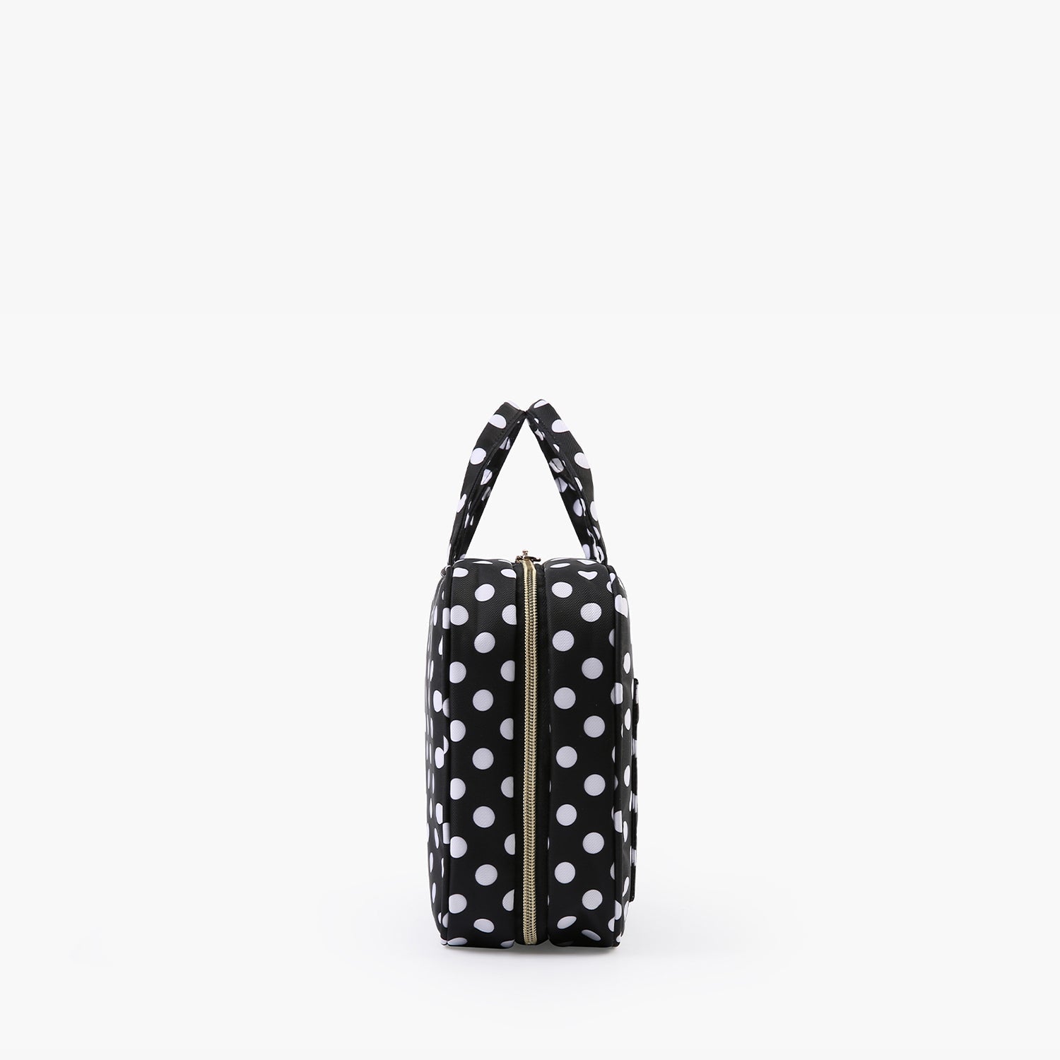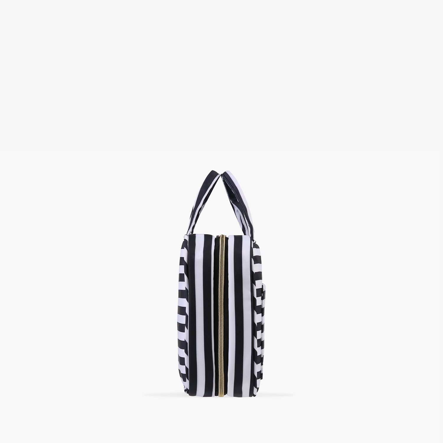 Deze stijlvolle zwart-wit gestreepte toilettas combineert mode met functionaliteit. Gemaakt van waterafstotend materiaal, met een ruim interieur en meerdere vakken om al je verzorgingsproducten georganiseerd op te bergen – ideaal voor zowel thuis als op reis.