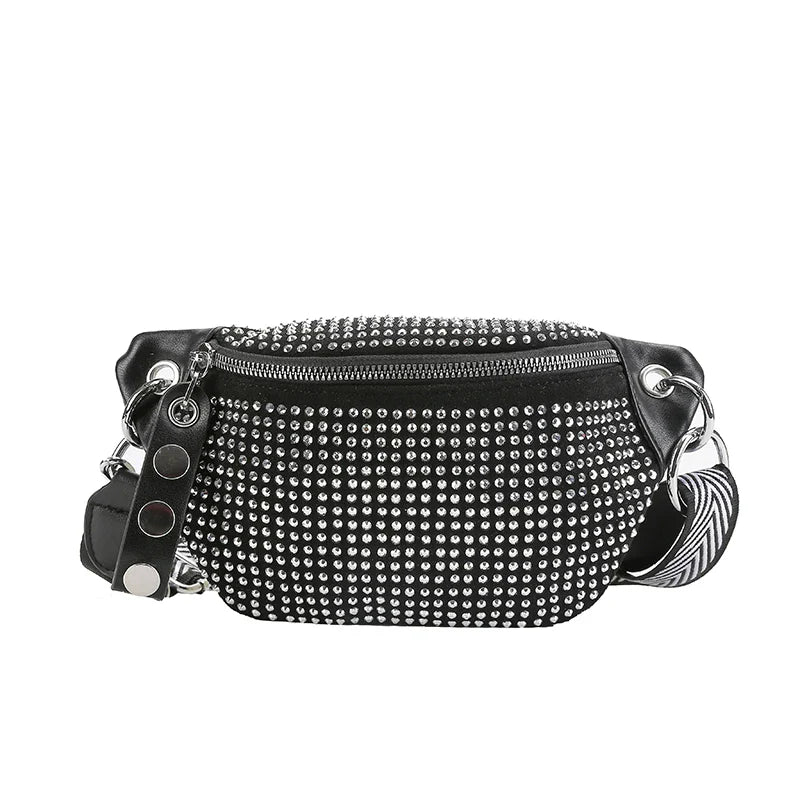 Deze zwarte heuptas met strass steentjes combineert glamour en functionaliteit. De sprankelende details maken hem perfect voor een festival of avondje uit, terwijl de praktische indeling ideaal is voor dagelijks gebruik. Met de stevige schouderband en metalen ketting draag je hem comfortabel en stijlvol.