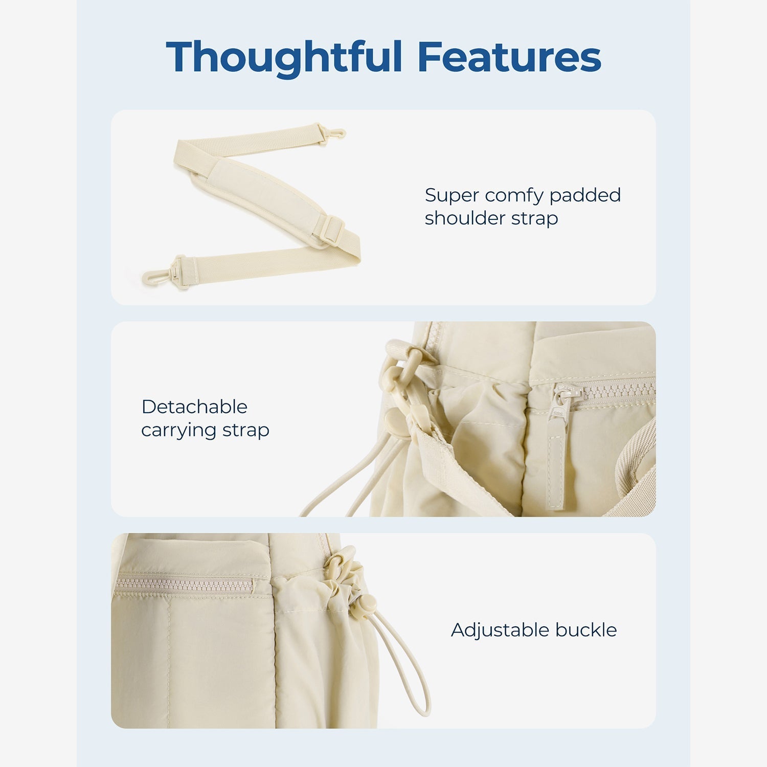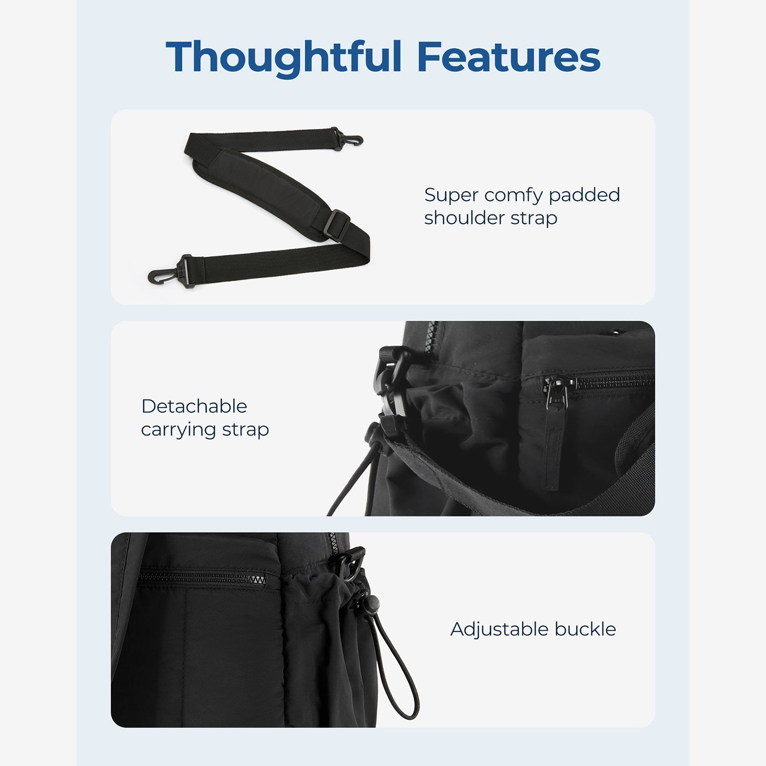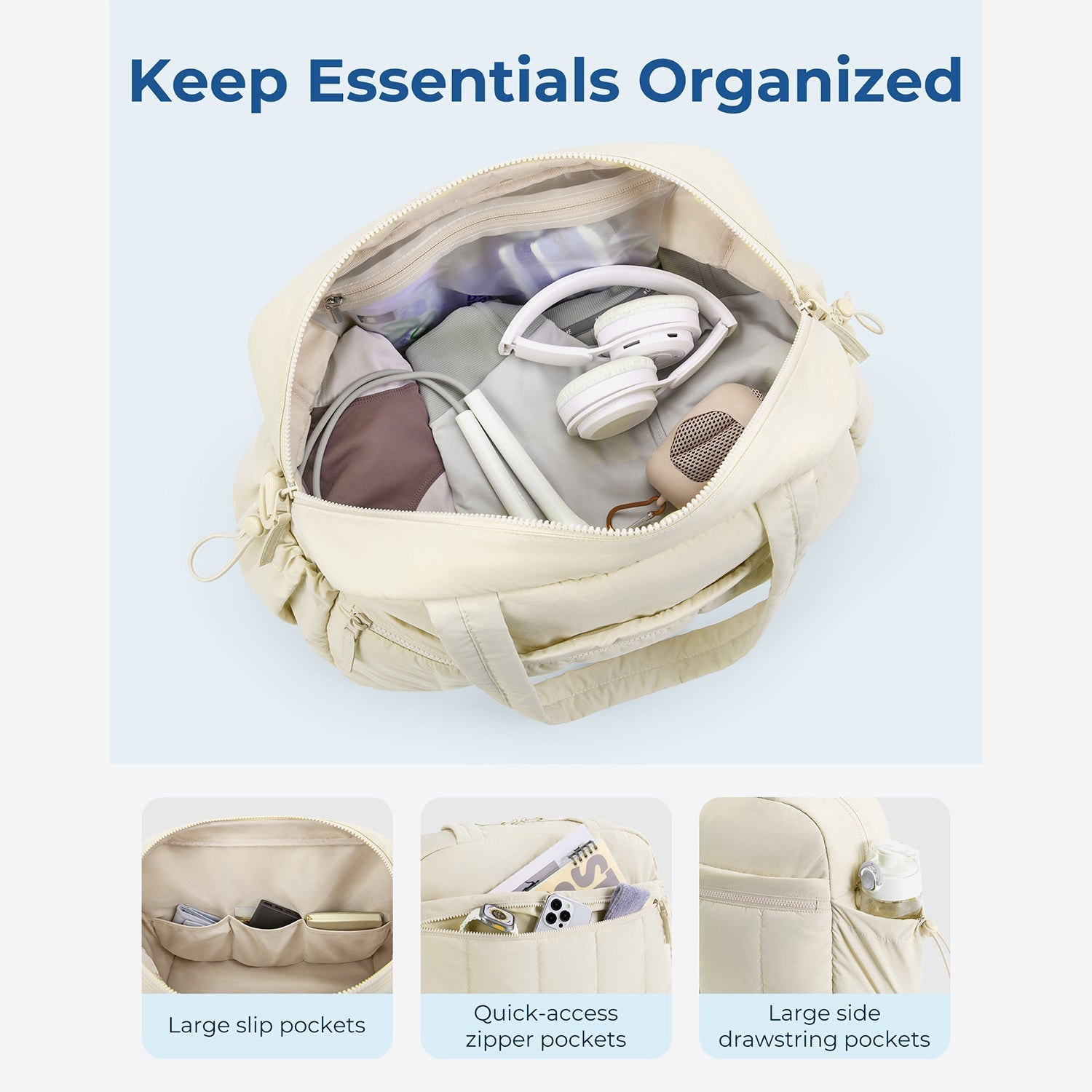 De tas beschikt over een groot hoofdvak, een transparant PVC-vak voor toiletartikelen en meerdere kleine opbergvakken voor snelle toegang tot essentials. Gemaakt van stevig, waterafstotend materiaal en voorzien van comfortabele handgrepen.